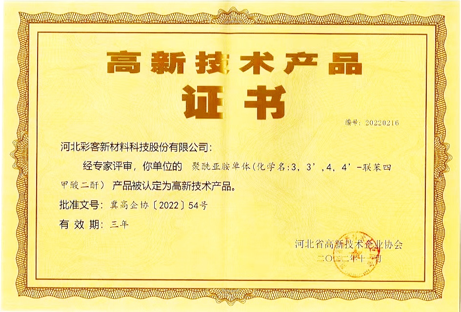河北彩客新材料科技股份有限公司是一家專注于高性能精細化工產品研發、生產及銷售的高新技術企業,主要產品為高性能有機顏料中間體(DMSS、DATA、DMS、DIPS)、食品添加劑中間體 DMAS、新材料聚合單體 BPDA 等。